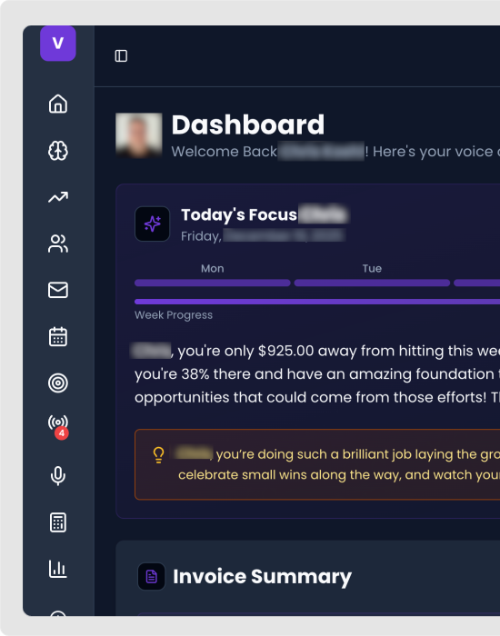 Using advanced AI, VoFlow analyzes your real activity and real results inside the platform—then shows you the specific actions that keep you on track to hit your weekly goal.
