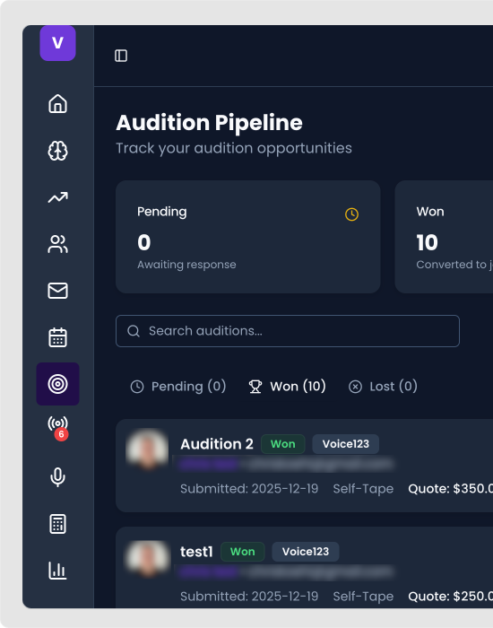 VoFlow’s Audition Pipeline™ tracks every audition you submit—pending, won, or lost—while quietly analyzing your results in the background.