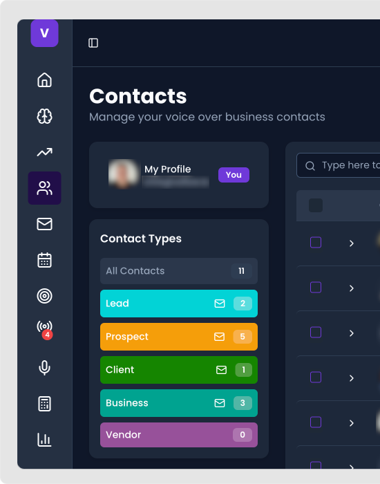 VoFlow’s Contacts (Customer Relationship Management™) system keeps everything connected—leads, prospects, clients, vendors, or any custom contact type you create.