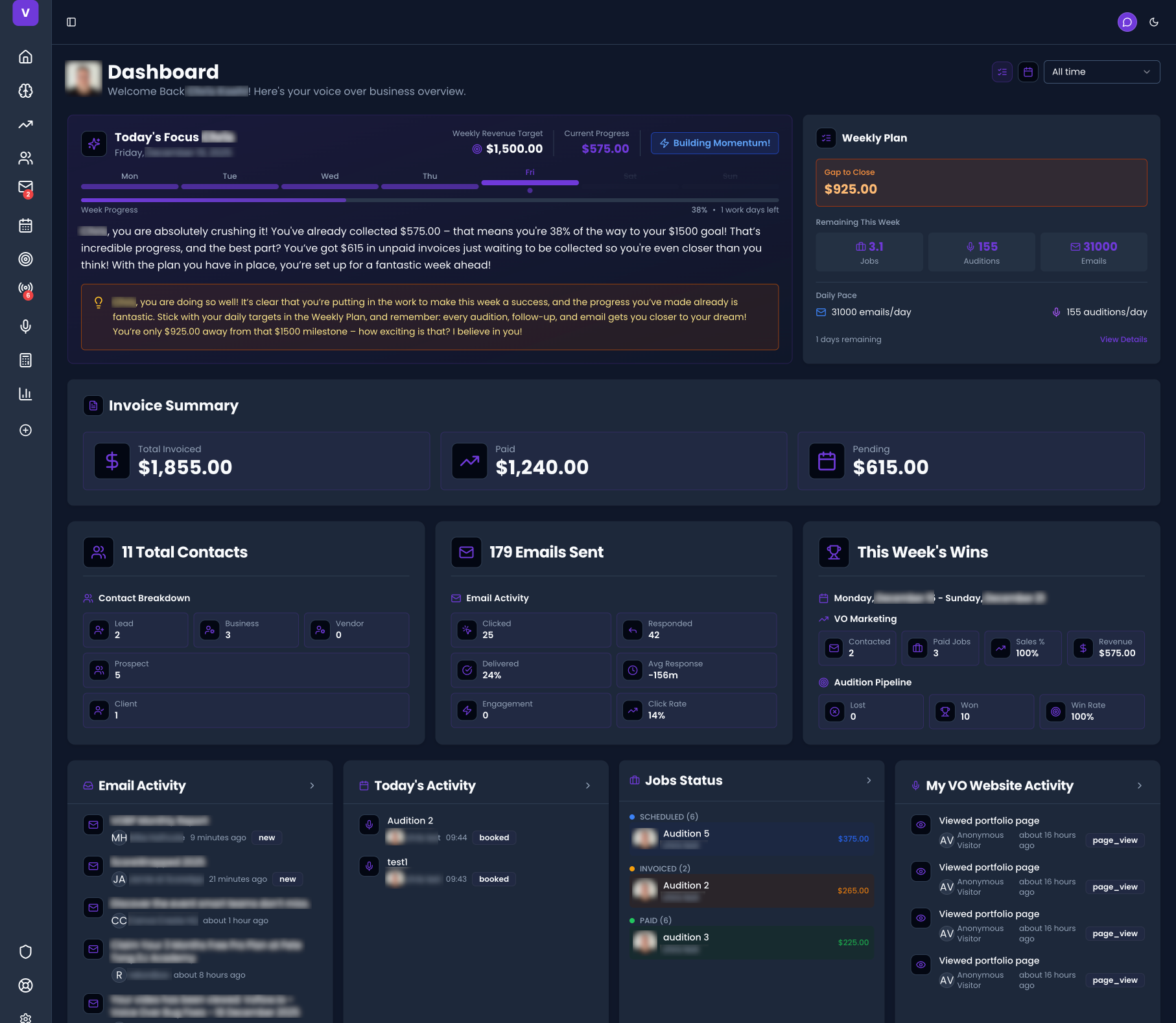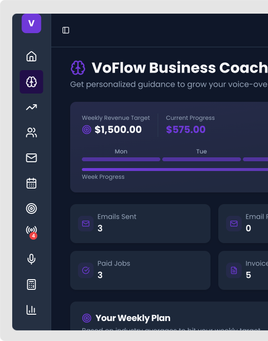 VoFlow is built specifically for voice over artists who want to run their work like a real business—without juggling tools, spreadsheets, or manual systems. Whether you’re just getting traction or already booking consistently, VoFlow adapts to where you are.