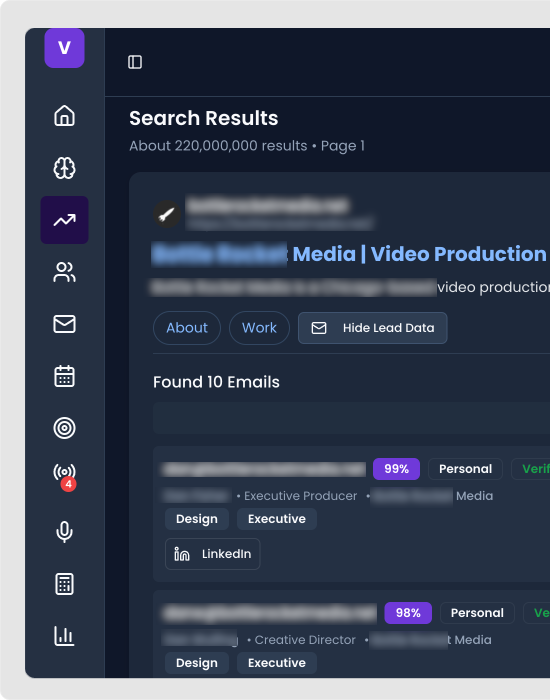 Inside VoFlow, you can instantly search unlimited video production studios, access verified, up-to-date contact information, add them to your CRM, and send cold outreach emails—all in just a few clicks.